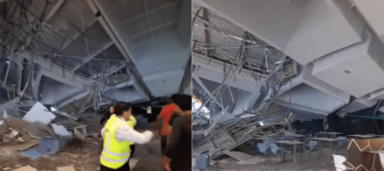 El pesado techo de fierro en el centro comercial Real Plaza Trujillo, una ciudad de la región La Libertad, cayó la...