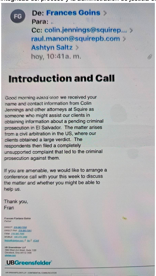 De hecho, una situación similar habría ocurrido en El Salvador, donde un abogado de Estados Unidos, actuando en nombre de Peppertree Capital y AMLQ, envió un correo electrónico a varios abogados ofreciendo sumas significativas de dinero a cambio de que entregaran información de casos criminales bajo reserva para ser compartida con dichas entidades. Este tipo de ofrecimiento resulta abiertamente ilegal y constituye un intento directo de penetrar indebidamente investigaciones protegidas por ley.